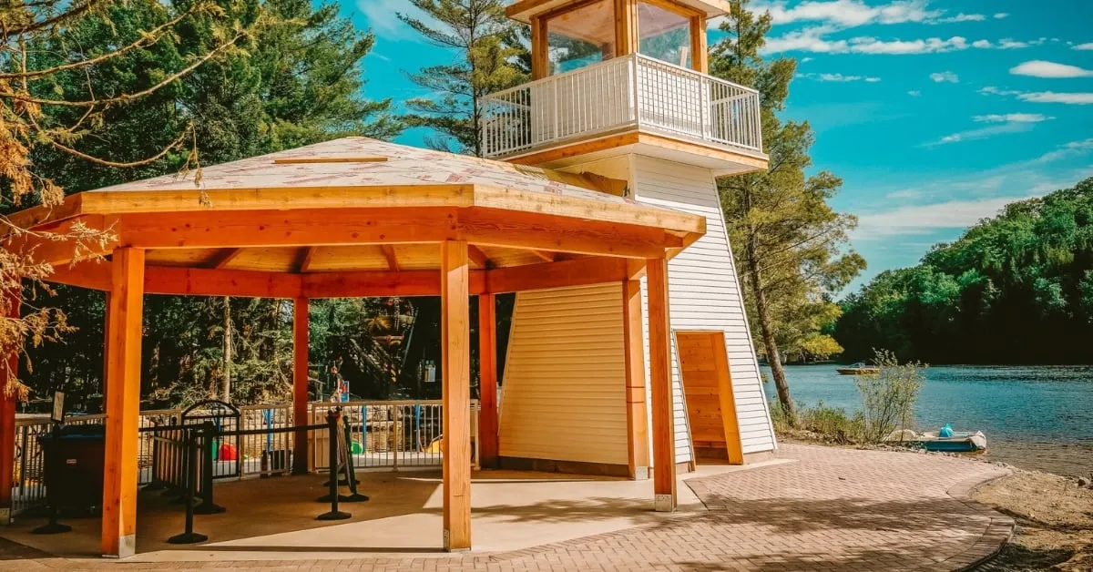 Quant à lui, a demandé l’installation de nombreux pieux sous l’ensemble de la dalle de béton du pavillon ainsi que dans l’eau. Puis, pour s’assurer d’un maximum de stabilité, 2 pieux supplémentaires ont été installés sous les poteaux principaux, ainsi que 3 pieux, juste pour la petite tour du Phare du pavillon.