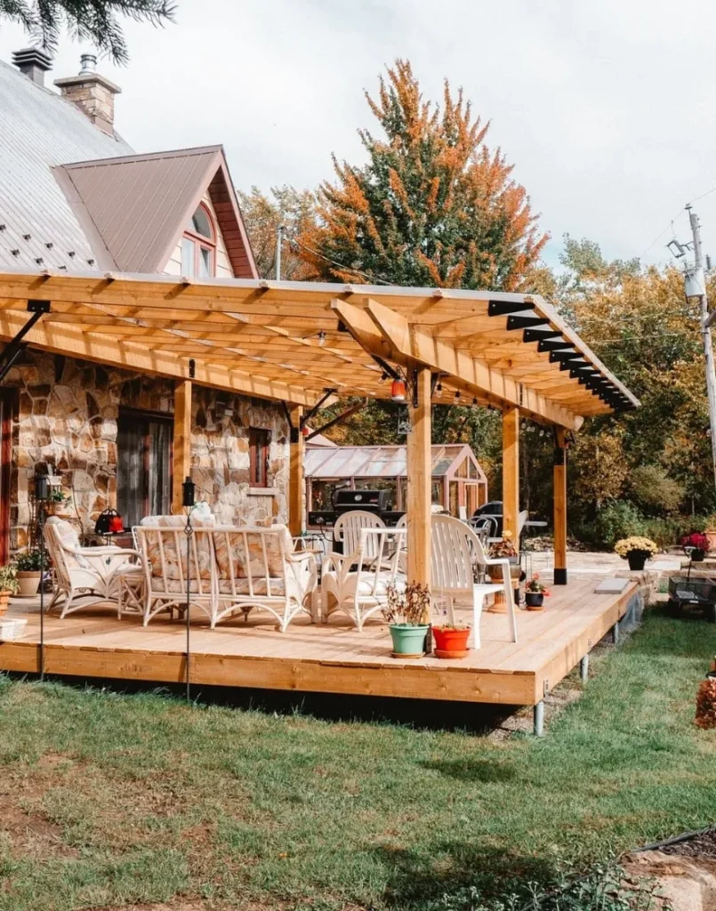 Pour profiter de la belle saison, quoi de mieux qu’un salon extérieur sur un patio en bois avec une pergola.